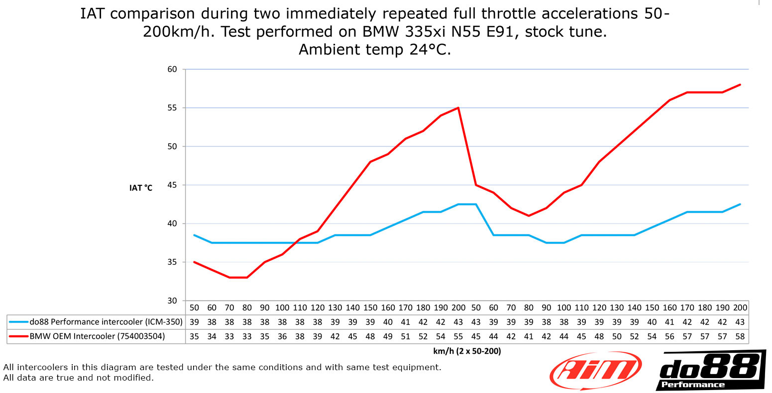 - Lower post intercooler air temperature at same conditions: 43°C (58°C), a substantial 15°C lower! Measured on 335xi N55 all stock except the intercooler.