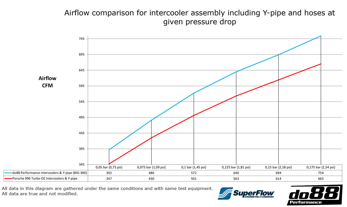 With our internal Superflow SF-1020 Probench flow bench, the airflow is confirmed as a complete system, with hoses on both the inlet and outlet, for both OEM 996 intercoolers and do88 performance intercoolers.