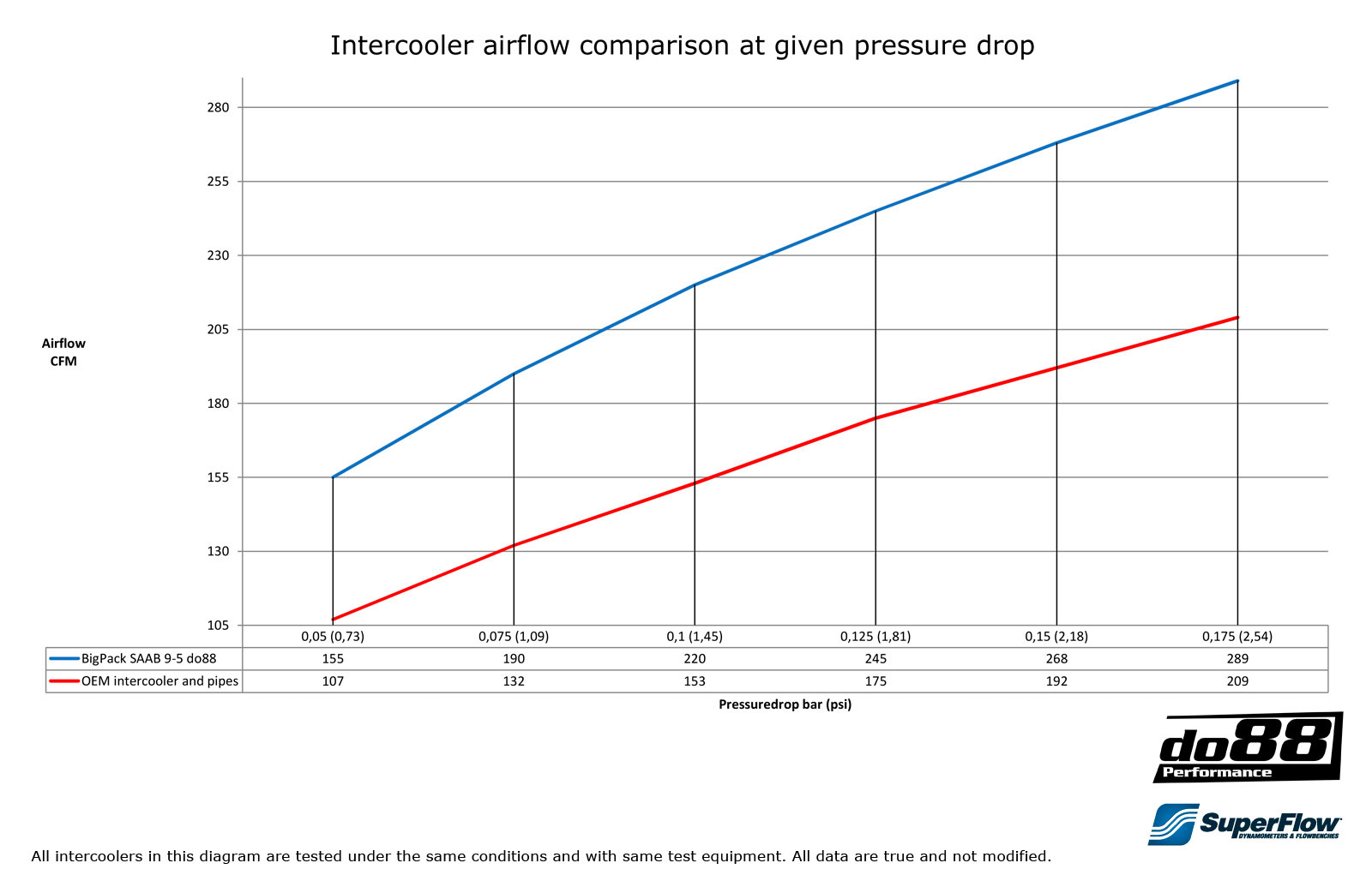 - Air flow at 0,15 bar / 2,18psi pressure drop: 268CFM (192CFM), do88 35% higher