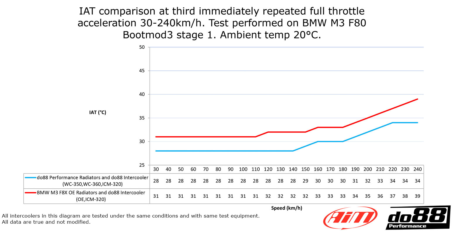 Reducing the water temperature in this circuit is directly equated with improved cooling of the charge air (lower IAT). Due to this reason, it is important to have high performance radiators in this system to maintain as low and stable IAT as possible during tough driving. During all test we have carried out during the development of our entire BMW F8X M2C/M3/M4 product range we see clearly how the peak power is directly equated with the IAT (Intake Air Temperature).