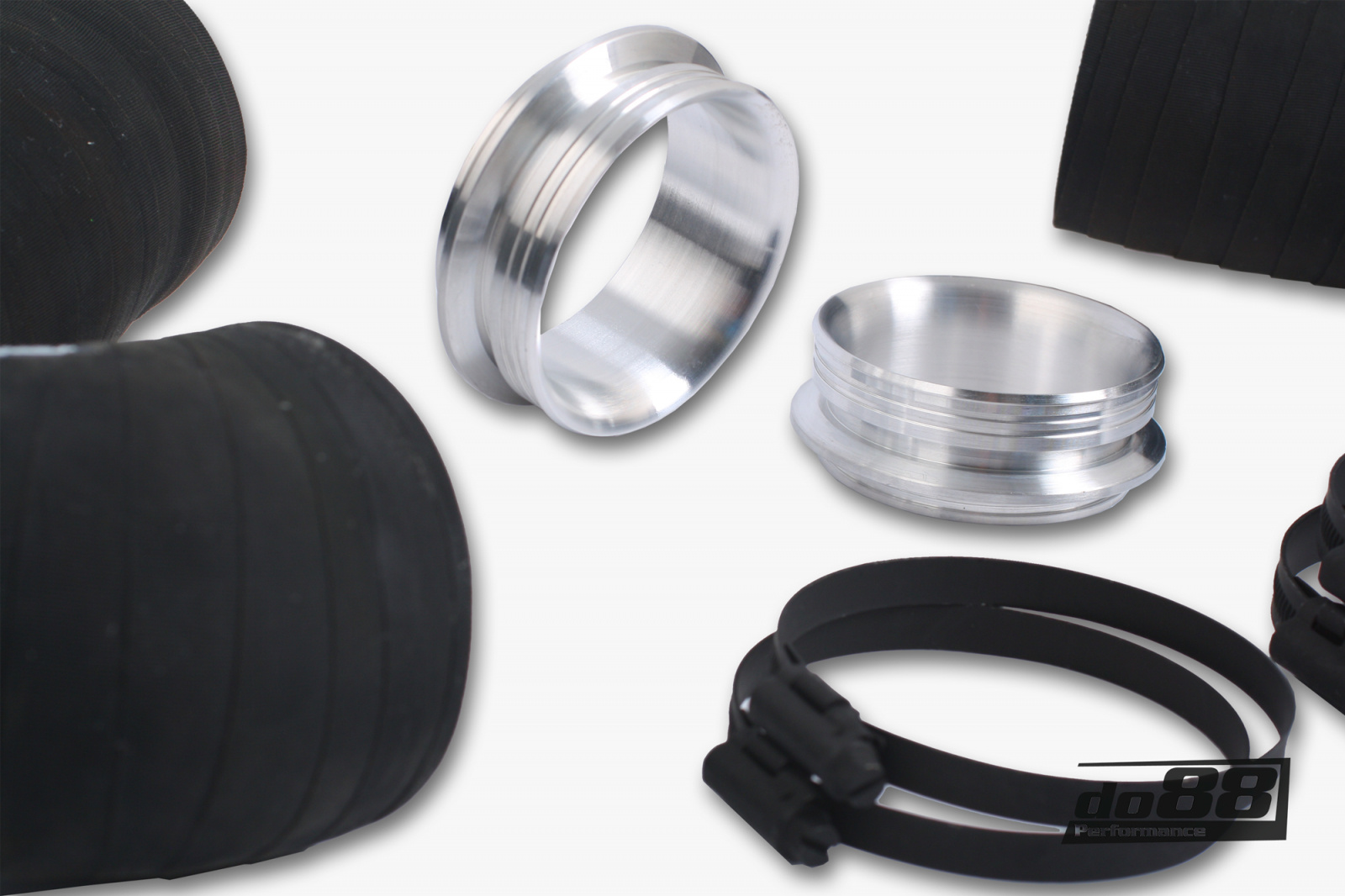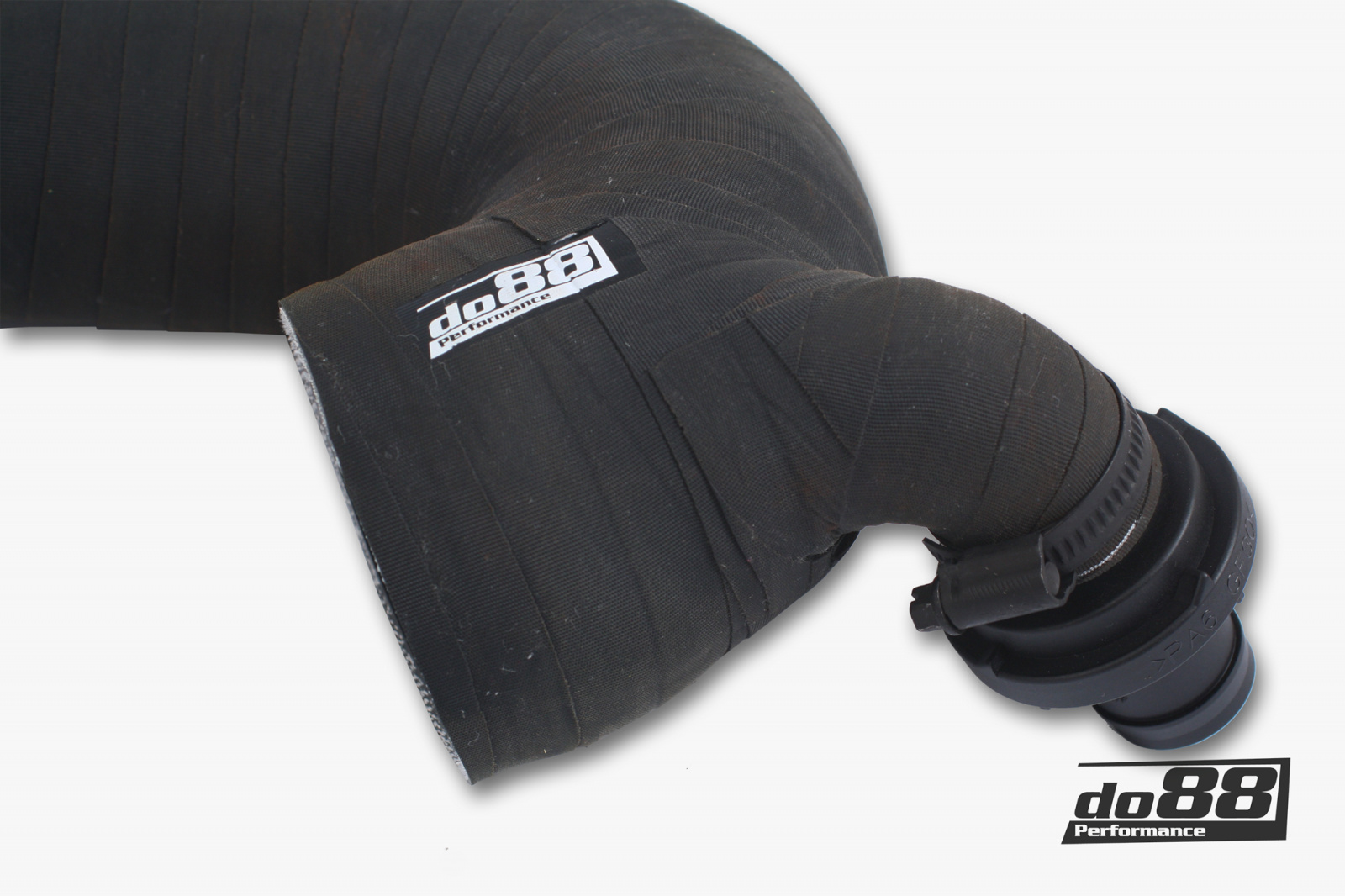 The kit comes with hoses in a textured black finish, CNC-machined adapters towards the turbos and top-quality, black hose clamps. The hoses are adapted to the OE air filter boxes, or the do88 air filter system with 66 mm connections.