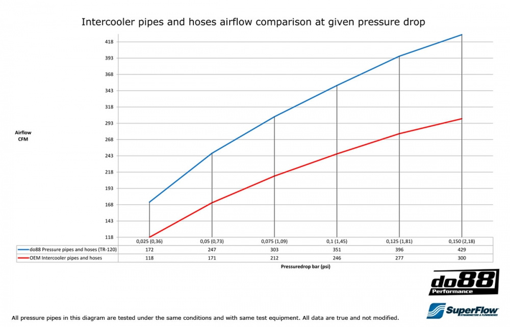 This kit is for you with high horsepower goals who want to upgrade to the absolute best! Our charge pipe has considerably better airflow than stock. This is verified by several tests, both in car and in our own SuperFlow SF-1020 flow bench.