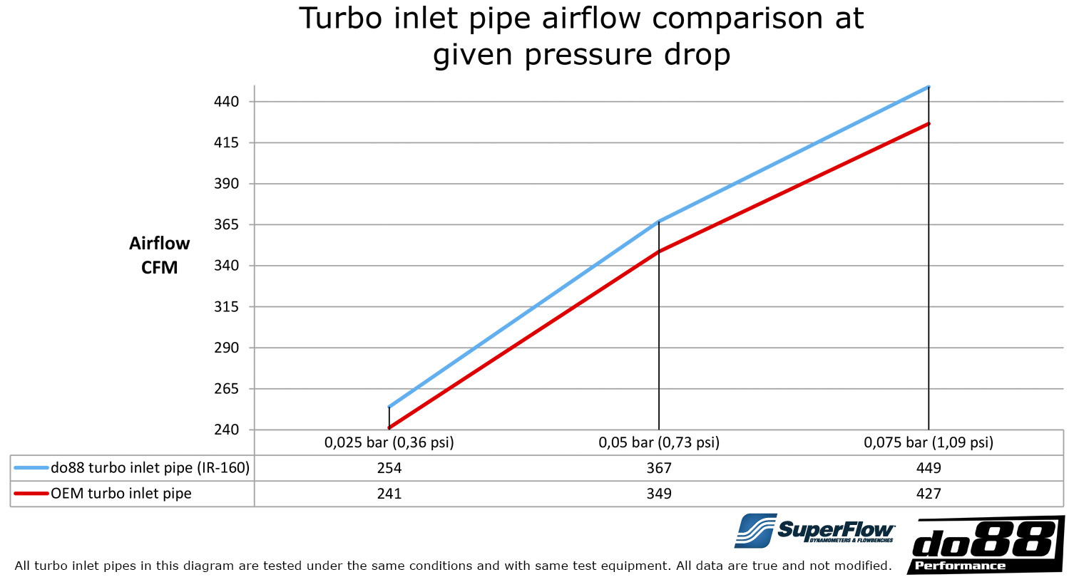 do88 turbo inlet pipe has an air flow at 0,075bar/1,09psi pressure drop 449 CFM, compared to the OEM pipe that has 427 CFM.