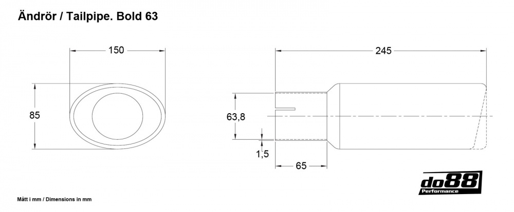 Tail pipe in high-gloss polished stainless steel. With a sleeve for easy installation on a 2,5" (63mm) exhaust pipe using a pipe clamp.